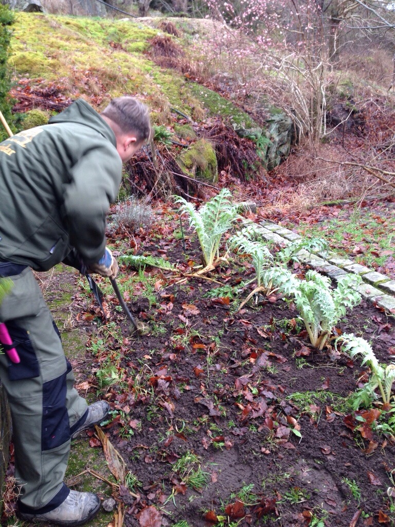 Idag har jag rensat bland kronärtskockorna. Tyvärr kom de inte i jorden för än i slutet av augusti tillsammans med strandkål. I morgon blir det att täcka in dem med träull och halm. Detta var mitt första blogginlägg. Återkommer i morgon med bilder från växthuset där orkidéerna börjat blomma.