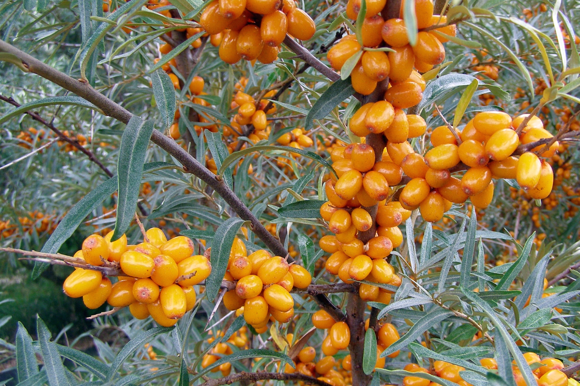 Vi har bunkrat upp med Svenne & Lotta, det svenska havtornet från försökstationen i Balsgård . Visserligen taggig men lägre buske med mycket rikligt med fullproppade C-vitaminrika bär. Dessutom får Du A och K vitamin, Folsyra och mycket annat av detta goda bär på köpet. Nu är våra buskar fulla med bär. Snart kommer ett recept på god marmelad att ringla på glassen eller som tillbehör till ostbrickan.