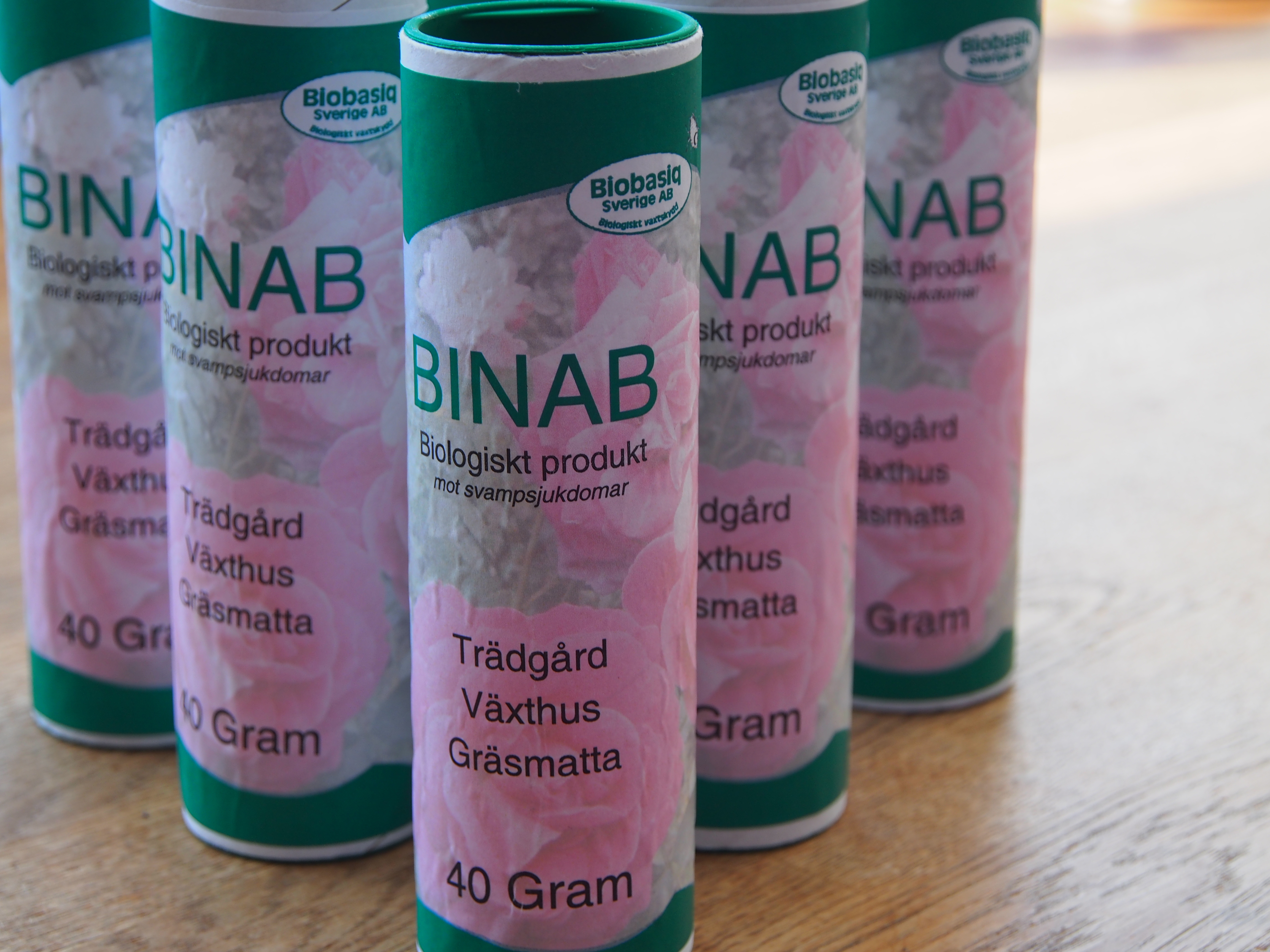 Nu när regnet står som spön i backen kommer svampsjukdomarna som på beställning. I dag finns inga effektiva kemiska medel för vanligt folk. Som tur är finns det dock hjälp. Sprutvattna (dvs. spruta mycket rikligt på växterna så mängder av medlet hamnar även på jorden) med BINAB, ett biologiskt preparat med miljoner av nyttiga svampar som livnär sig på skadliga svampar så som rost, svartfläcksjuka med flera. Nyttosvamparna är igång och jobbar efter ca 48 timmar. Frysen är laddad med preparat. Fryst har pulvret en hållbarhet på 2 år. Bra till rosor, pioner, klematis, stockrosor och riddarsporrar m.fl. OBS! säg till i kassan, BINAB ligger i en särskild frys vid pannrummet.