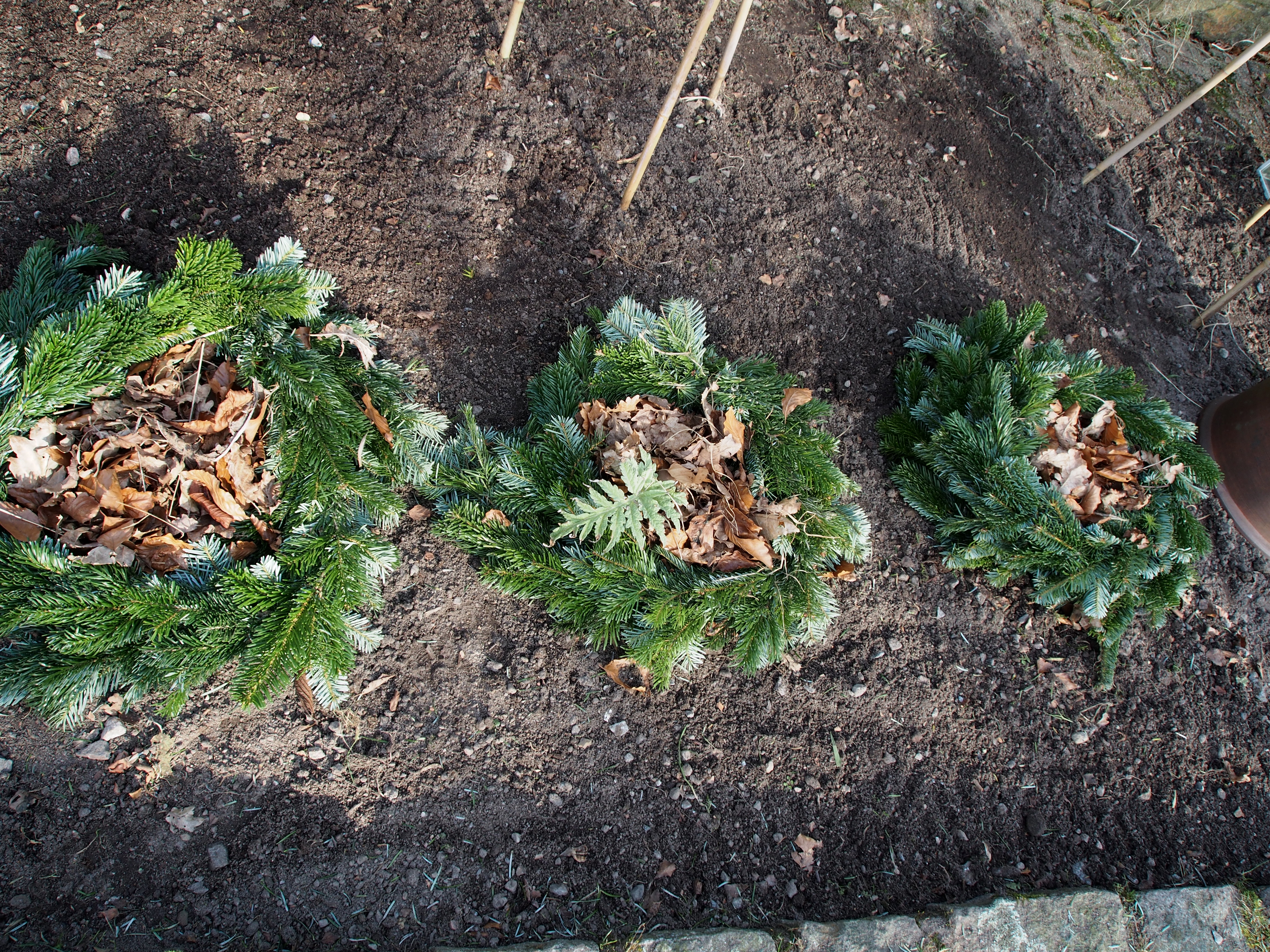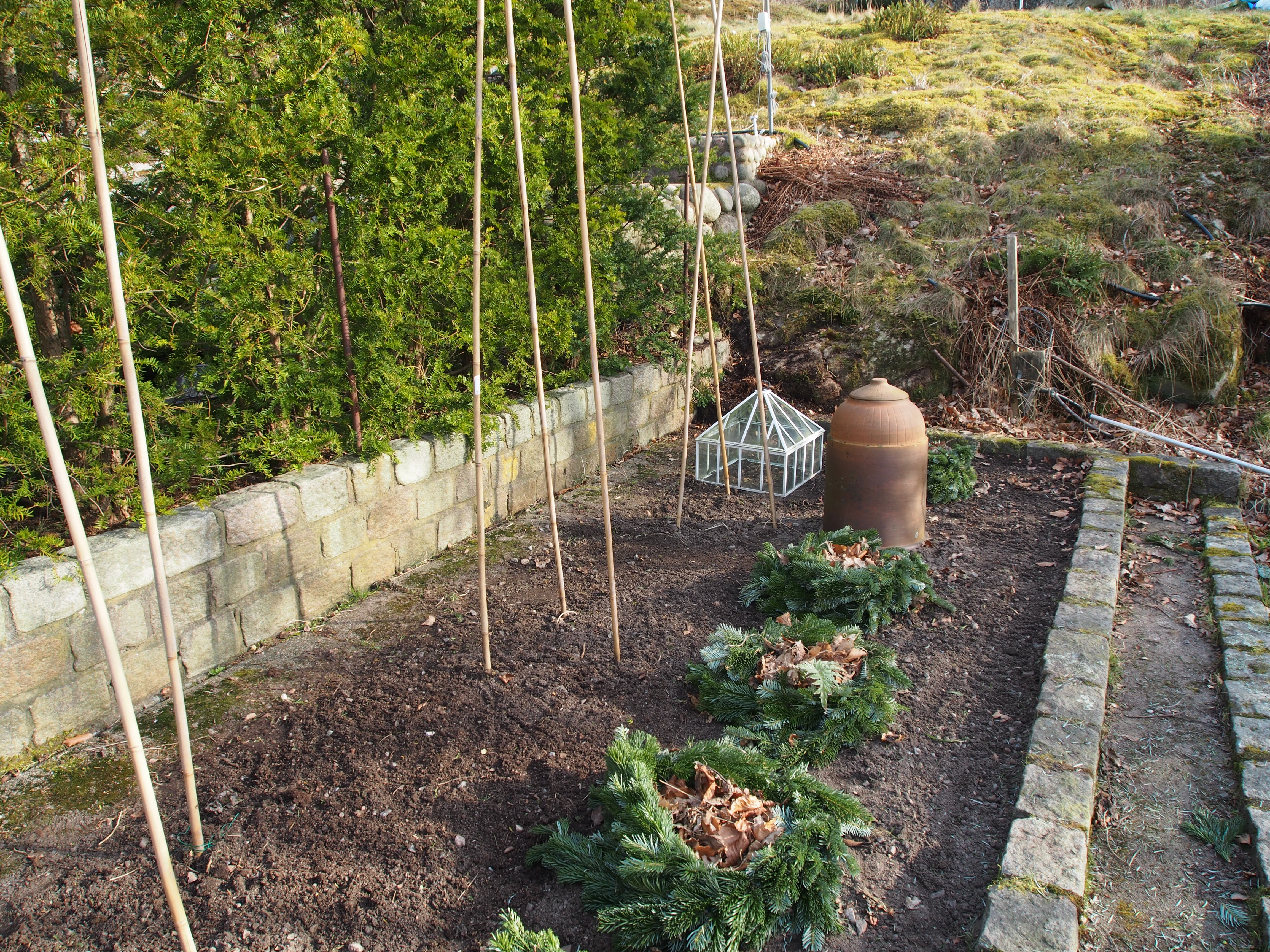 Kronärtskockorna hade sätt igång tidigt i år. Täckte det mesta av bladen med torra boklöv i en tuban av gammal lulgransgirlang. Ett av bladen var för stort och fick sticka upp. Den gamla engelska rabarberdrivaren får bli en drivare till strandkålen i år. Hoppas på fina mjälla vitaminstinna skott.