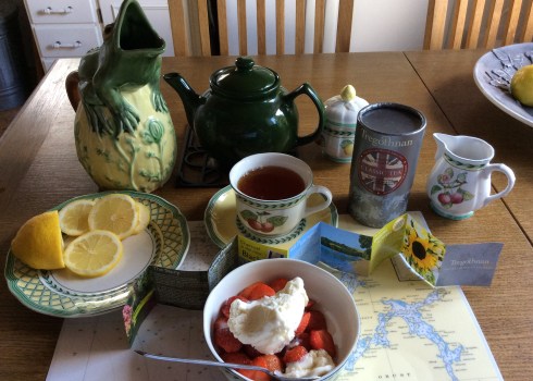 Nu på sönagsfikat blir det verkligen egetproducerat. Egen glass, citroner från trädgården, jordgubbar och te från Tregotham i Cornwall, England. I år har jag köpt tebuskar från deras odling och jag hoppas få ihop några blad för en testund med egenodlade teblad nästa år. De växer ihop med mina utomhus Gardenior.