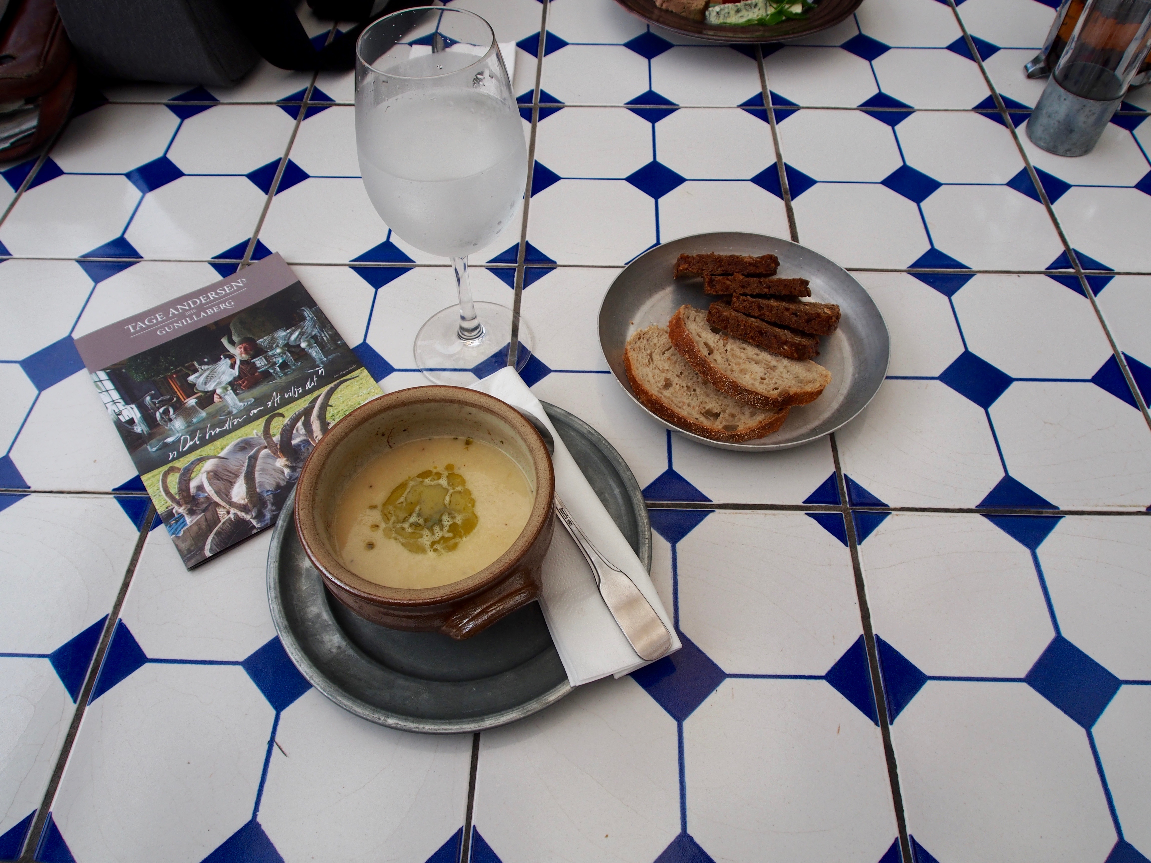OLYMPUS DIGITAL CAMERADet blev enLunchtallrik med te till mig och en blomkålssoppa till Annika. först trodde jag att det låg en tomat på min tallrik men det var en inkokt plommon i vin. En riktig smakhöjare.