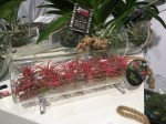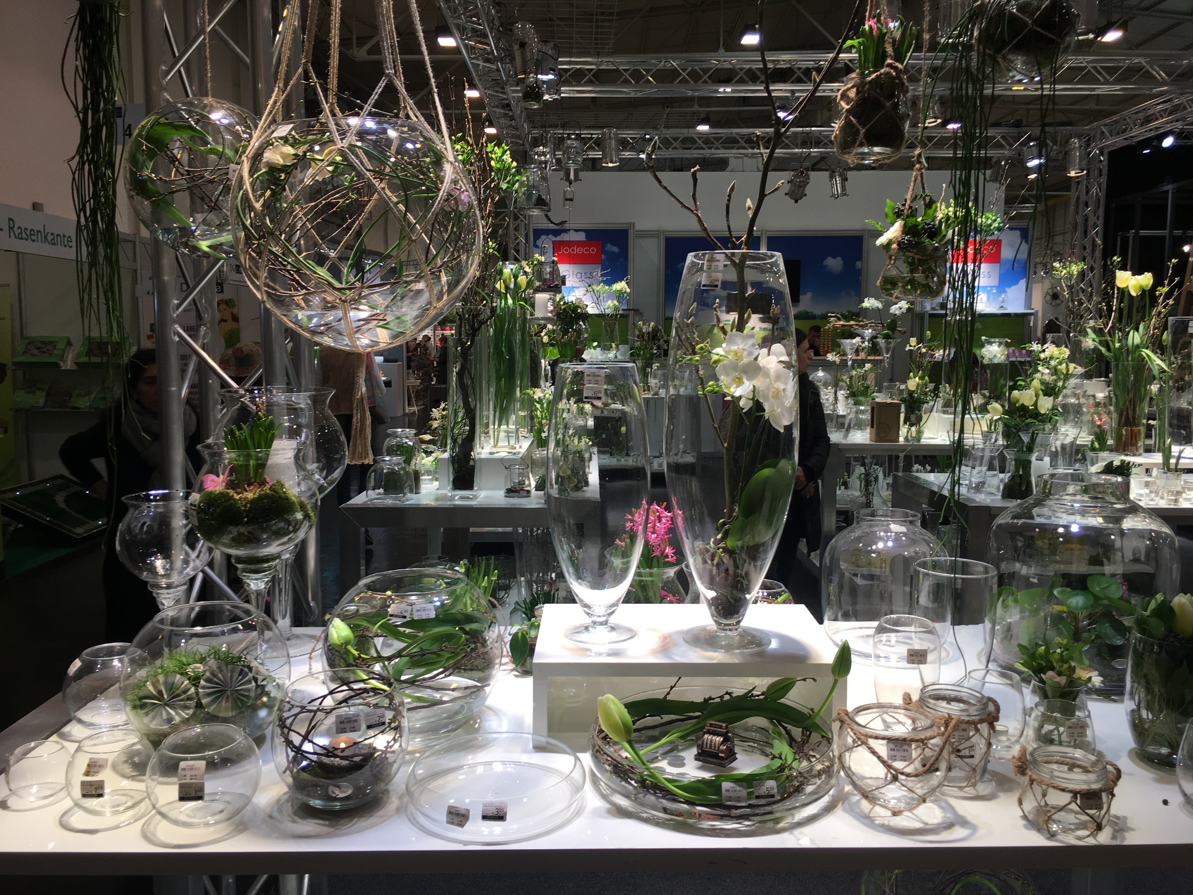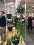 Efter två hallar från Italien kom jag in i Nederländska hallen. Här överöstes jag av orkidéer Dock mestadels brudorkide och vandor. Man kan klart säga att trenden är mycket orkidéer, köttätande växter och airplant, mestadels som Tillandsior men även miniananas med frukter, till detta fanns det mängder med glas , i år ska nämligen växterna växa i glasbehållare i de alla möjligaste former. Jag gick förbi en kille med tillandsiamössa, såg senare att det var en skyltdocka.