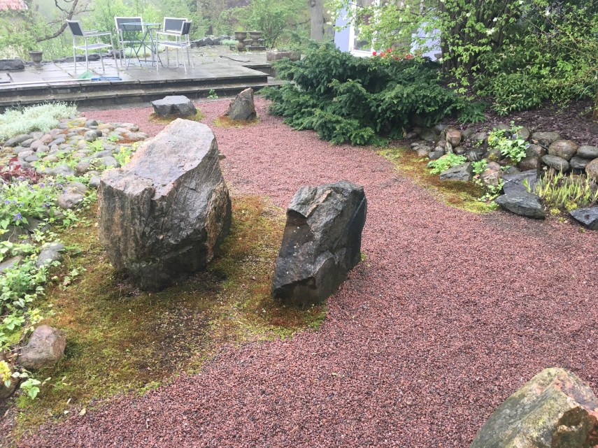 Vackra stenar i kontrast till grus med en del mossa, här gillar vi mossan. Dock lite svårare än normalt att rensa en sådan här yta.