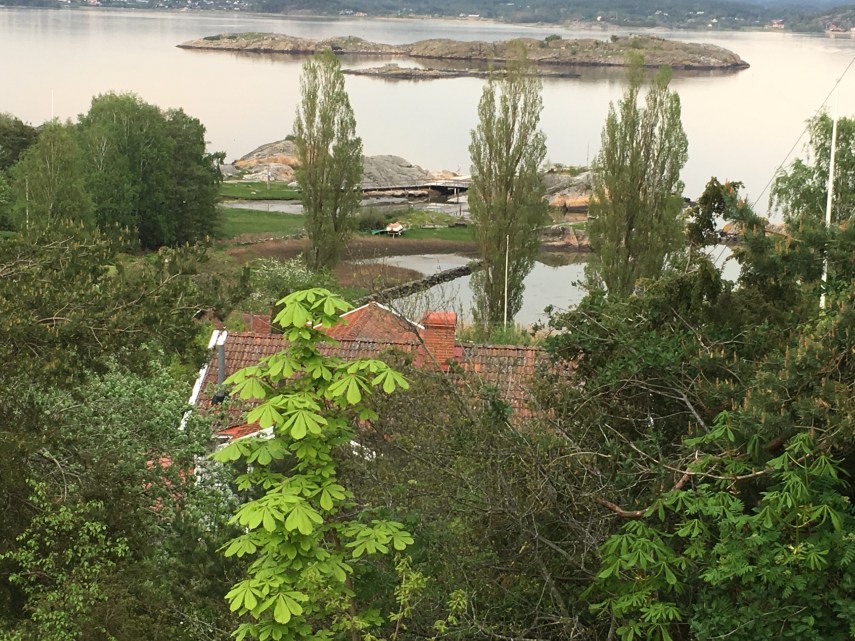 Det är helt vindstilla och ljudet från fartyg och stojiga ungdomar vid stranden blandar sig fint i all fågelsång.