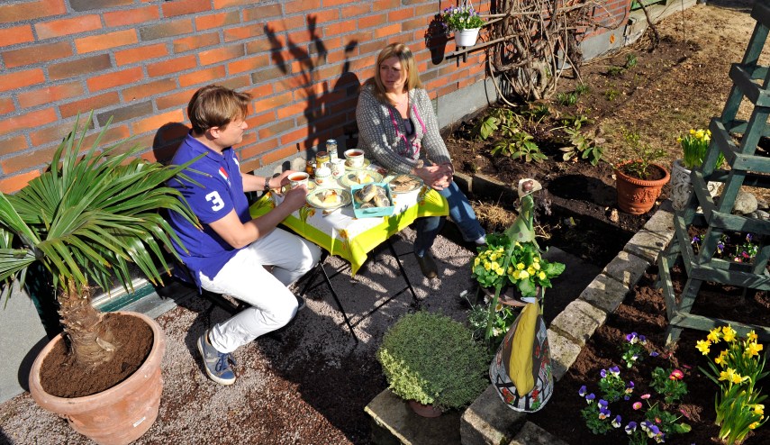 I vår kaffegrop, en sådan där liten nedsänkt uteplats som värms upp av hus eller mur och skyddas för vind. Jordtemperaturen var i dag 33 grader och teglet 37. Här är det varmt.