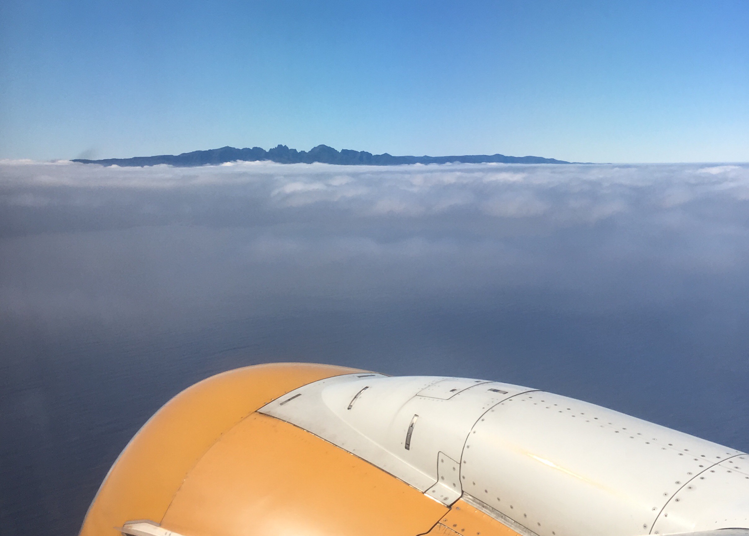 Flygresan till Madeira tar ca 4,5 timmar från Göteborg . Vi flyger över Europa tills vi kommer över norra Portugal och staden Porto, sen ser vi bara vatten tills några bergstoppar sticker ensamt upp över molnen.