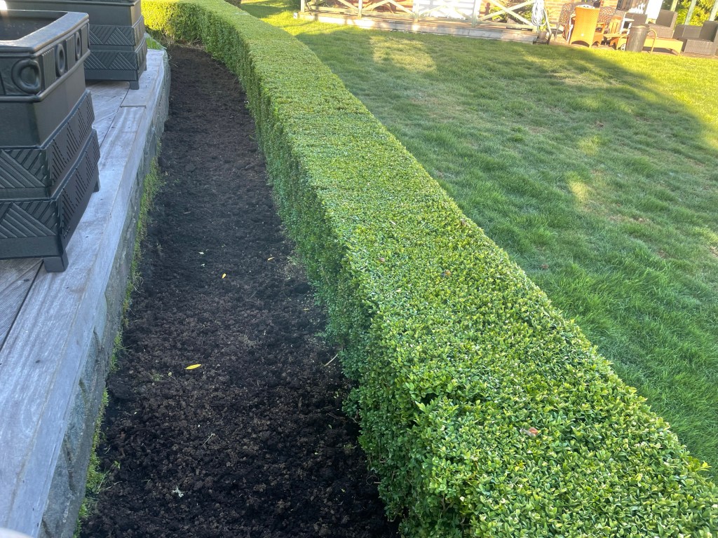 Dahliarabatten är röjd och jordförbättrad. Nu på måndag ska de drivna plantorna ner i jorden. i 25 graders värme flyttades härifrån meterhöga mjölkklockor till sin nya perennrabatt. Vid ingången står nu dessa fina exemplar på var sida om ingången och med var sin blå nyans. Precis så som var tanken när jag fick iden till denna nya rabatt. Den ska man njuta av när man sitter i soffan under klipputsprånget som anlades förra året. Jag hoppas hinna få nya brädor till den mer än 150 år gamla soffan. Här har man en vacker vy av trädgården, fantastisk utsikt över Hakefjorden och här kan man njuta av dagens sista solstrålar.
