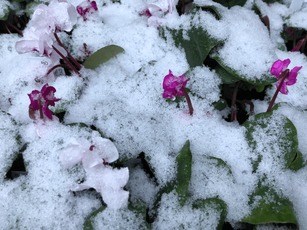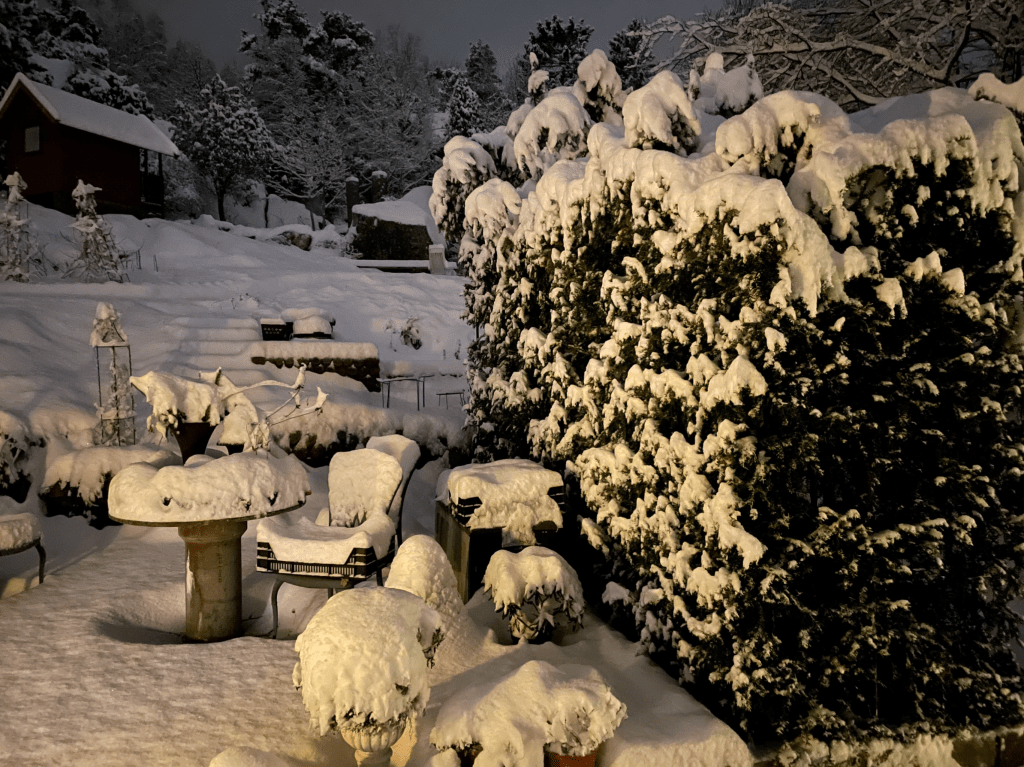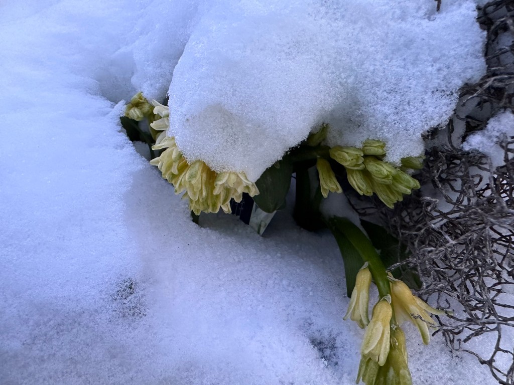 Vintergäck, hyacinter, cyklamen mm hade tittat upp när Kung Bore vände tillbaka. Nu vadar jag omkring i 20 cm snö i vackert vinterlandskap. Tyvärr ser det ut som att min årliga sättlöksplantering som jag alltid gör 15 mars skjuts fram någon vecka.